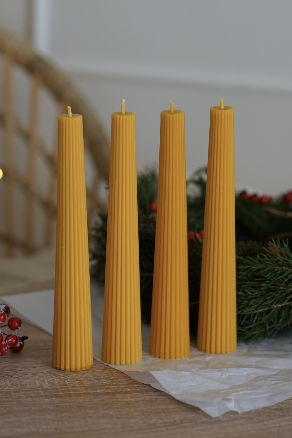 Užijte si kouzlo adventního času s našimi ručně vyrobenými svíčkami z čistého včelího vosku, které Váš domov provoní jemnou medovou vůní. Aria je vysoká svíčka zdobená po celém obvodu jemnými proužky. Dolní část svíčky je široká a směrem nahoru se postupně zužuje. Sada obsahuje 4 kusy svíček ze včelího vosku do Vašich adventních věnců a svátečních aranžmá.