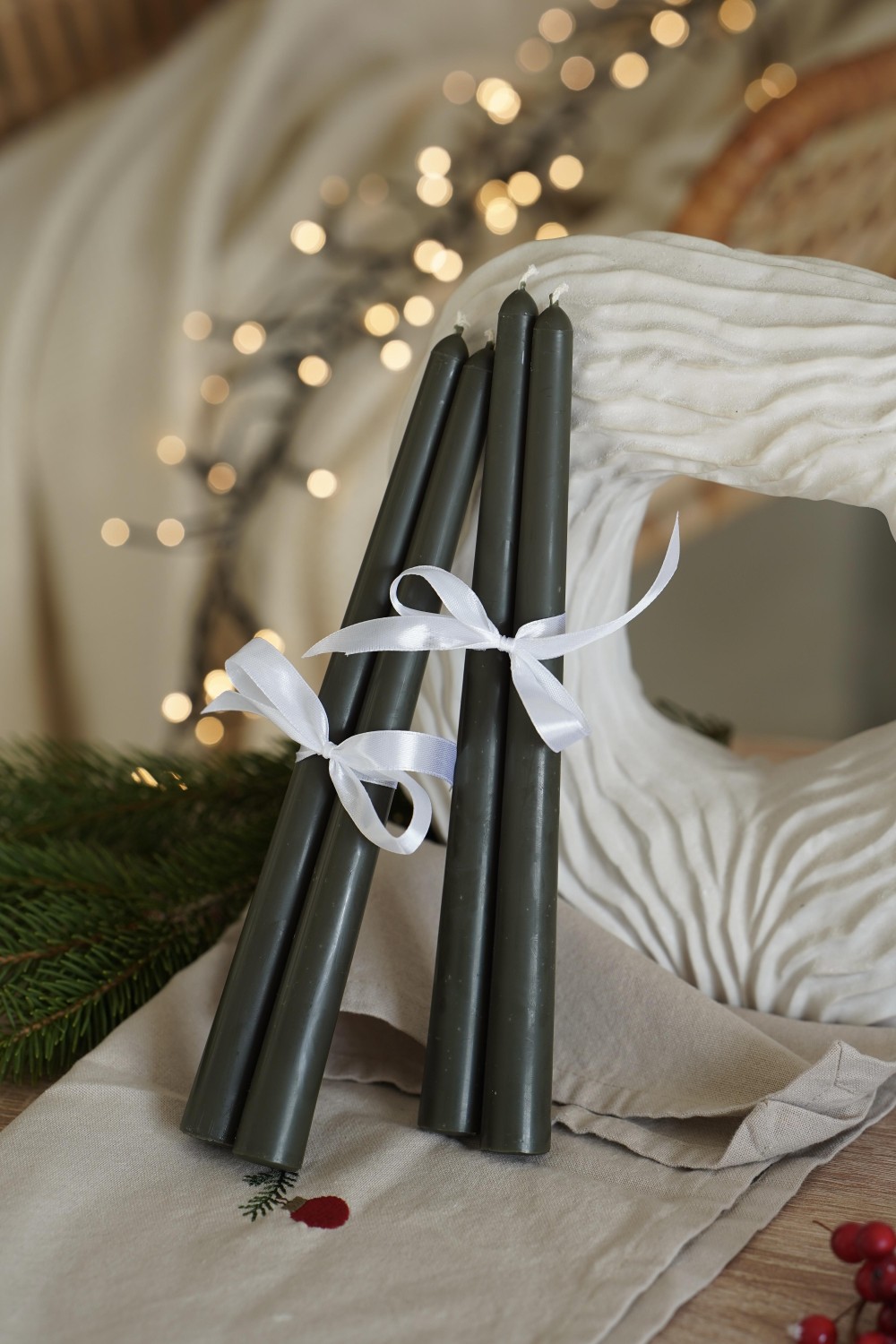 Užijte si kouzlo adventního času s našimi ručně vyrobenými svíčkami. Svíčky jsou vyrobené ze směsi včelího vosku a sójového vosku v krásném tmavě zeleném odstínu. Eleni je vysoká a zužující se, přičemž její tvar končí zaoblenou horní částí. Sada obsahuje 4 kusy svíček ze směsi včelího a sójového vosku do vašich adventních věnců a svátečních aranžmá.