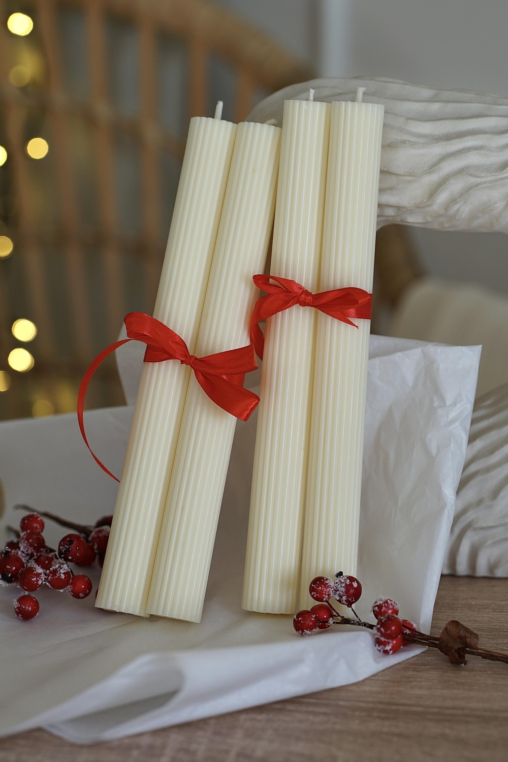 Užijte si kouzlo adventního času s našimi ručně vyrobenými svíčkami. Svíčky jsou vyrobené ze směsi bílého včelího vosku a sójového vosku v krásném bílém odstínu. Thea je vysoká svíčka zdobená po celém obvodu jemnými proužky. Sada obsahuje 4 kusy svíček ze směsi včelího a sójového vosku do Vašich adventních věnců a svátečních aranžmá.