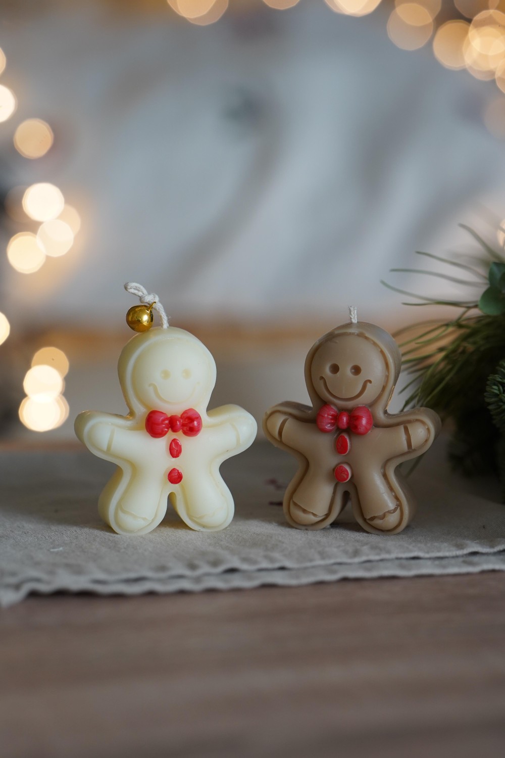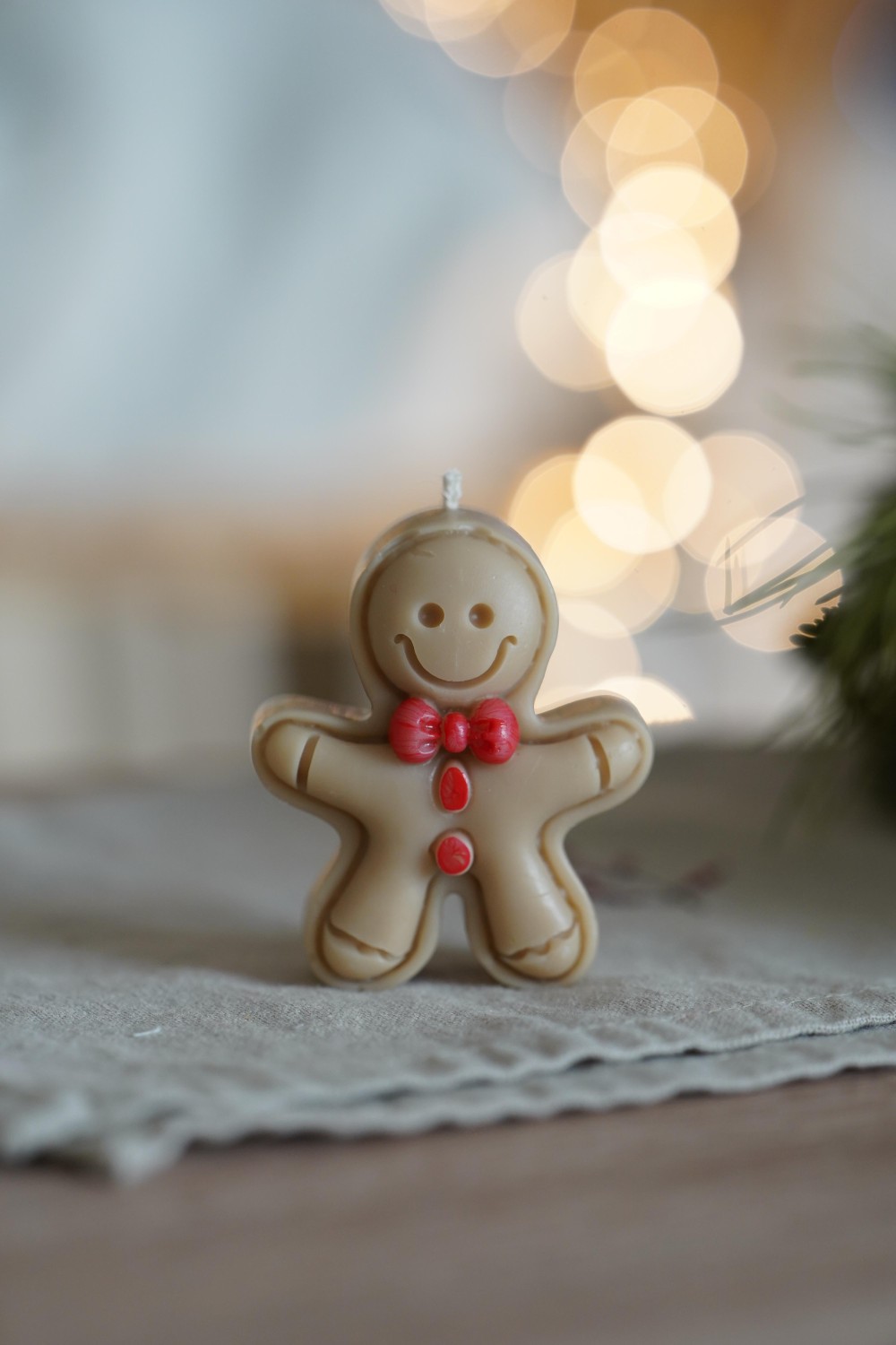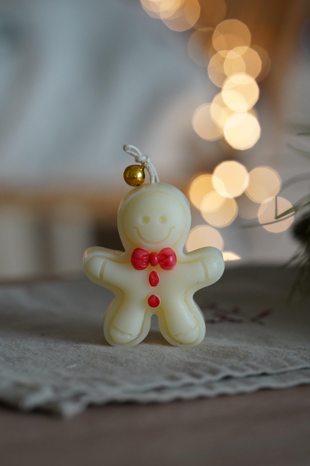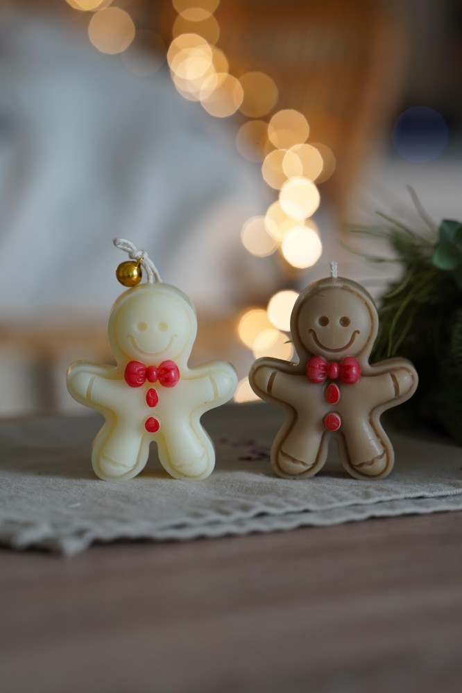 Vánoční svíčka ve tvaru roztomilého perníčku s mašličkou přináší kouzlo svátků a radost z maličkostí. Jednoduchý a přitom něžný vzhled v odstínech bílé a světle hnědé krásně doplní výzdobu a navodí pravou vánoční atmosféru.