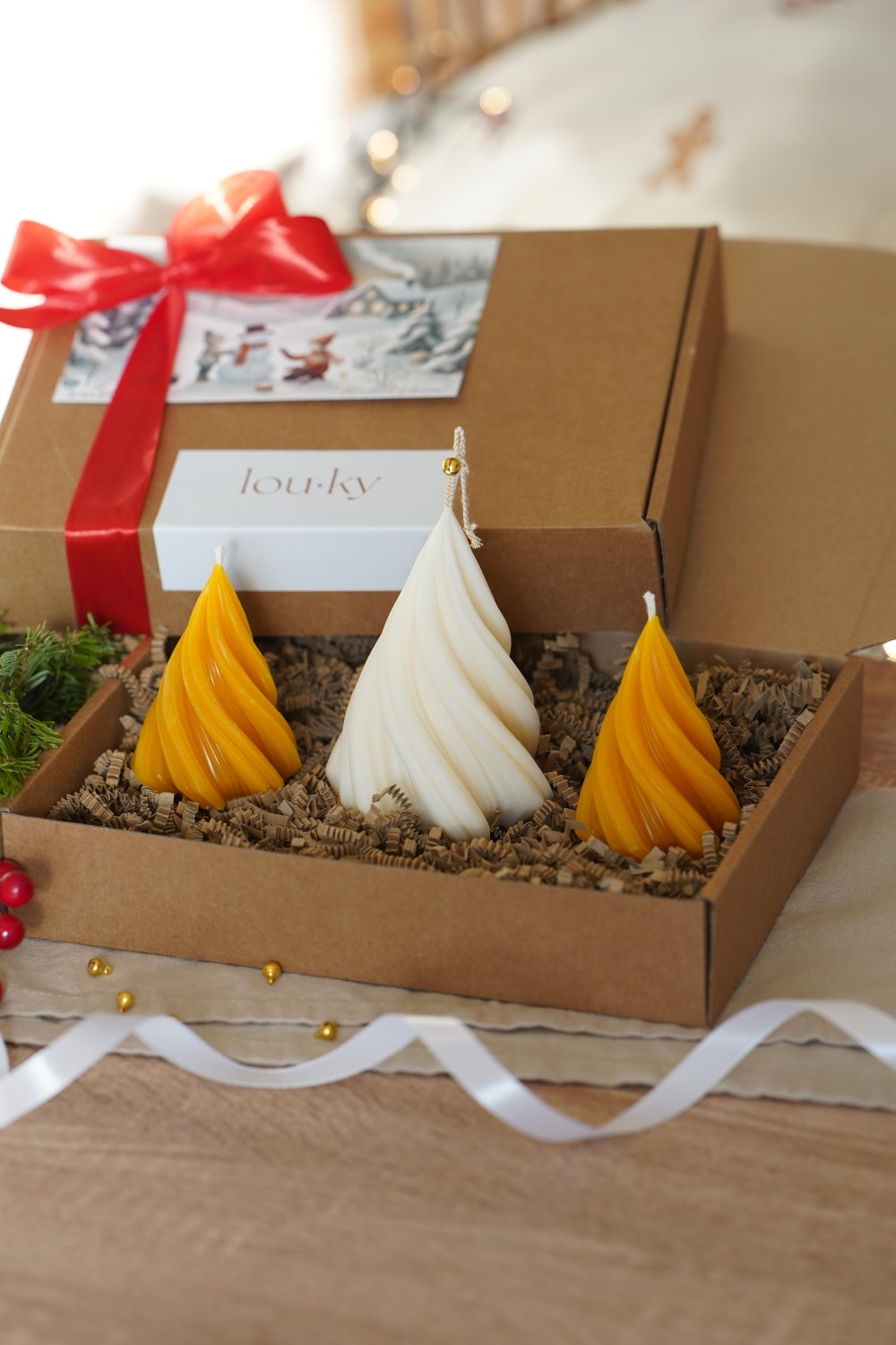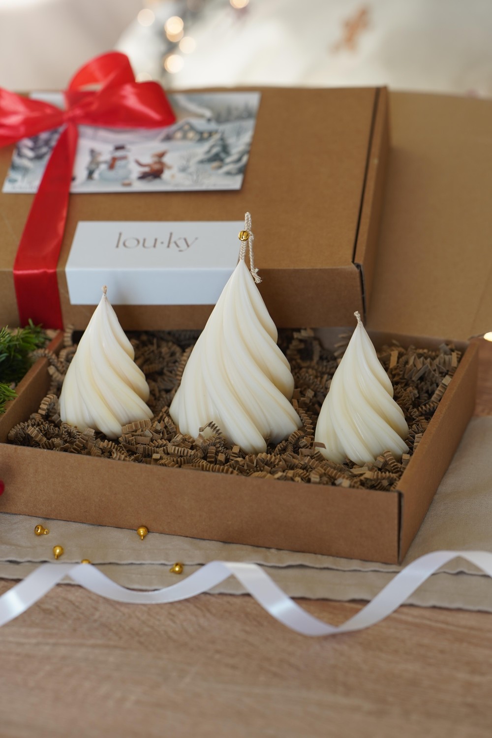 Sada svíček se skládá z jednoho velkého točeného stromku a ze dvou malých točených stromečků. Svíčky jsou ideální způsob jak do svého domova přinést vánoční atmosféru. Sada stromečků je elegantní doplněk pro Vaše vánoční stolování nebo jako dárek pro Vaše blízké. Svíčky jsou zabalené v papírové dárkové krabici se stuhou viz. fotky. Stromečky si můžete vybrat z čistého sójového nebo včelího vosku.