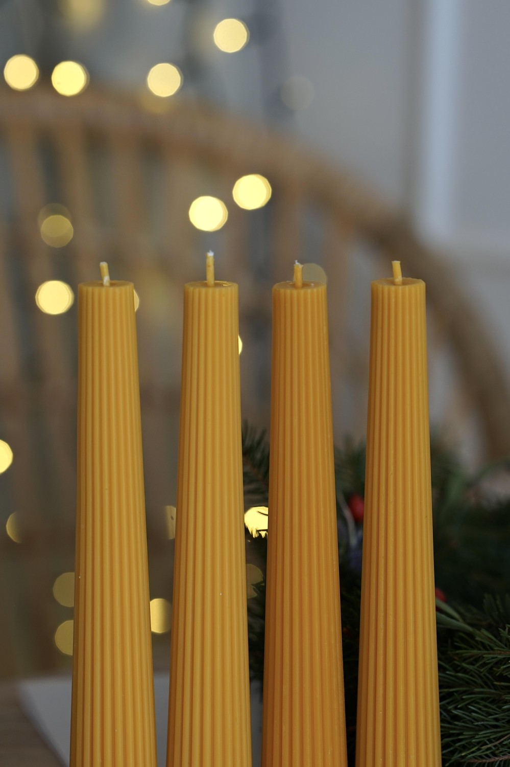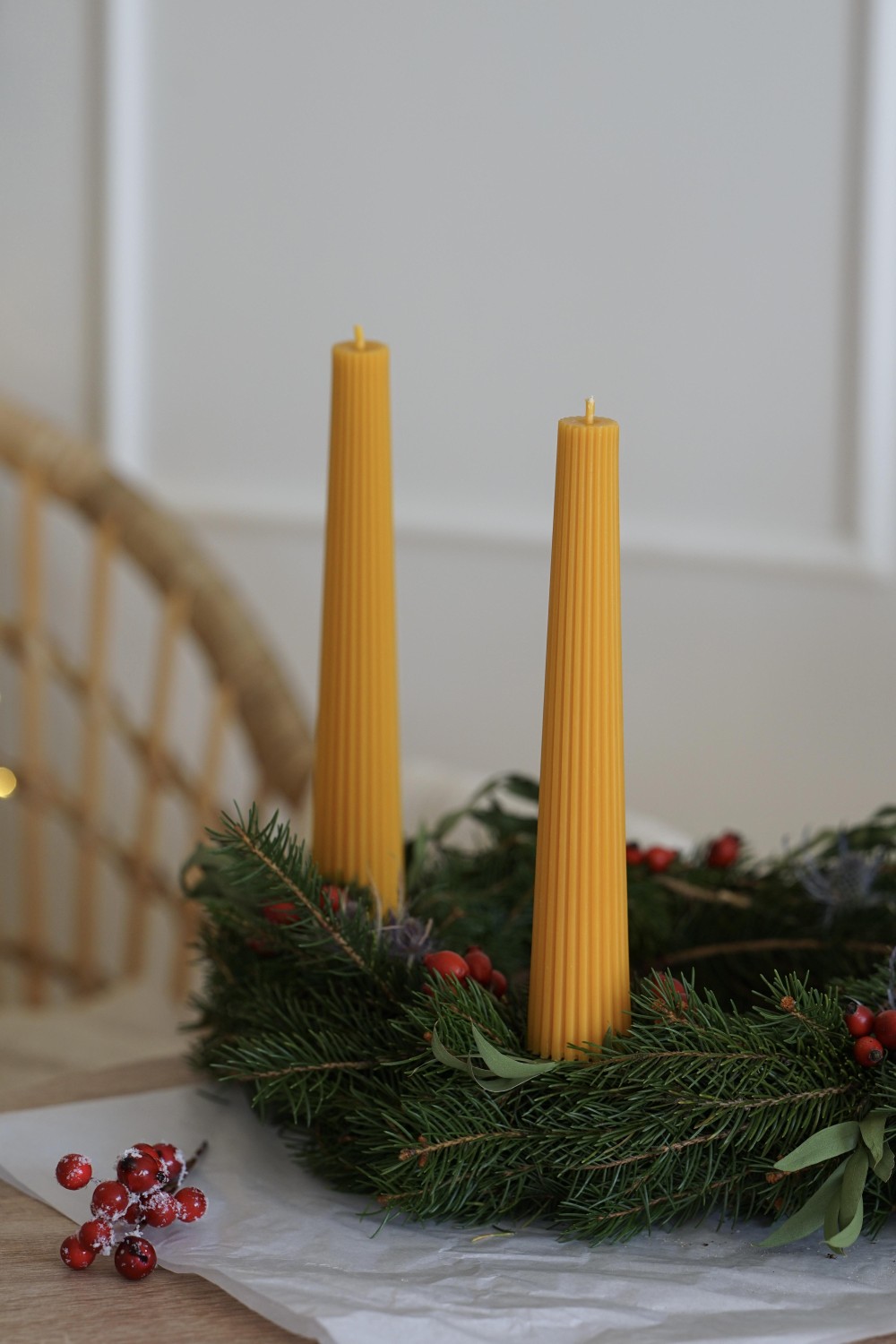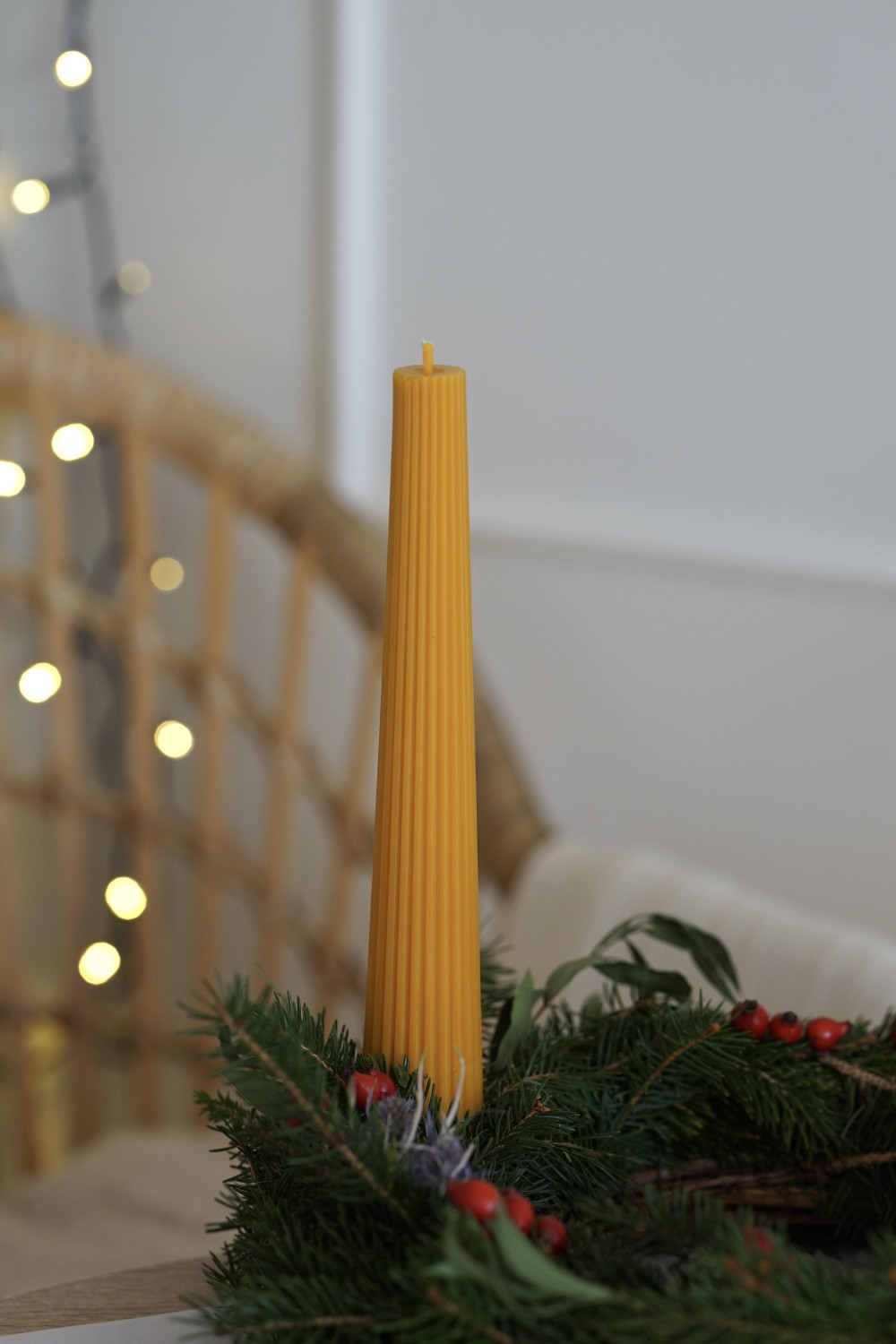 Užijte si kouzlo adventního času s našimi ručně vyrobenými svíčkami z čistého včelího vosku, které Váš domov provoní jemnou medovou vůní. Aria je vysoká svíčka zdobená po celém obvodu jemnými proužky. Dolní část svíčky je široká a směrem nahoru se postupně zužuje. Sada obsahuje 4 kusy svíček ze včelího vosku do Vašich adventních věnců a svátečních aranžmá.