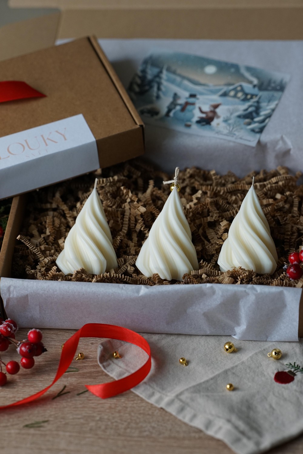Sada tří malých točených stromečků je ideální způsob jak do svého domova přinést vánoční atmosféru. Sada svíček je elegantní doplněk pro Vaše vánoční stolování nebo jako decentní dárek pro Vaše blízké. Svíčky jsou zabalené v papírové dárkové krabici se stuhou viz. fotky. Stromečky si můžete vybrat z čistého sójového nebo včelího vosku.