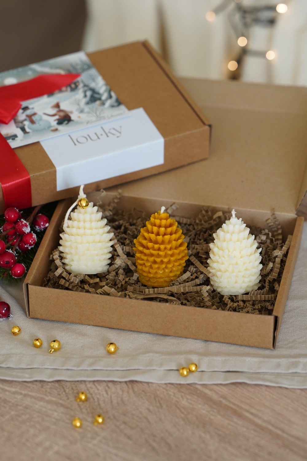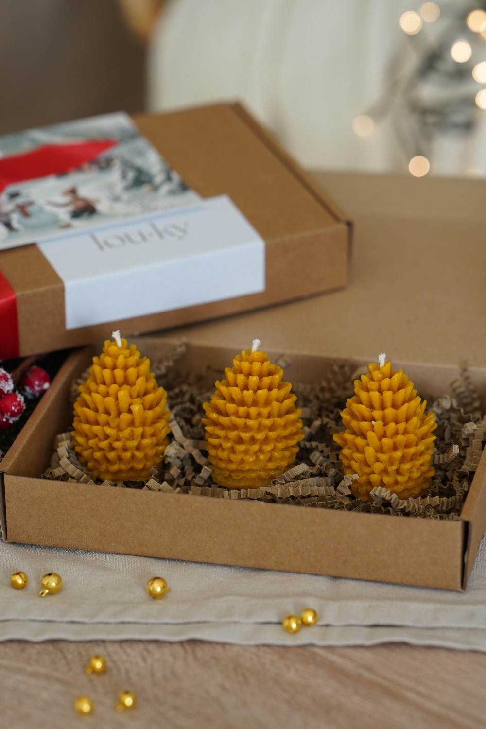 Sada tří šišek je ideální způsob jak do svého domova přinést vánoční atmosféru. Sada svíček je elegantní doplněk pro Vaše vánoční stolování nebo jako dárek pro Vaše blízké. Svíčky jsou zabalené v papírové krabici se stuhou viz. fotky. Svíčky šišek si můžete vybrat ze směsi sójového a bílého včelího vosku nebo žlutého včelího vosku.