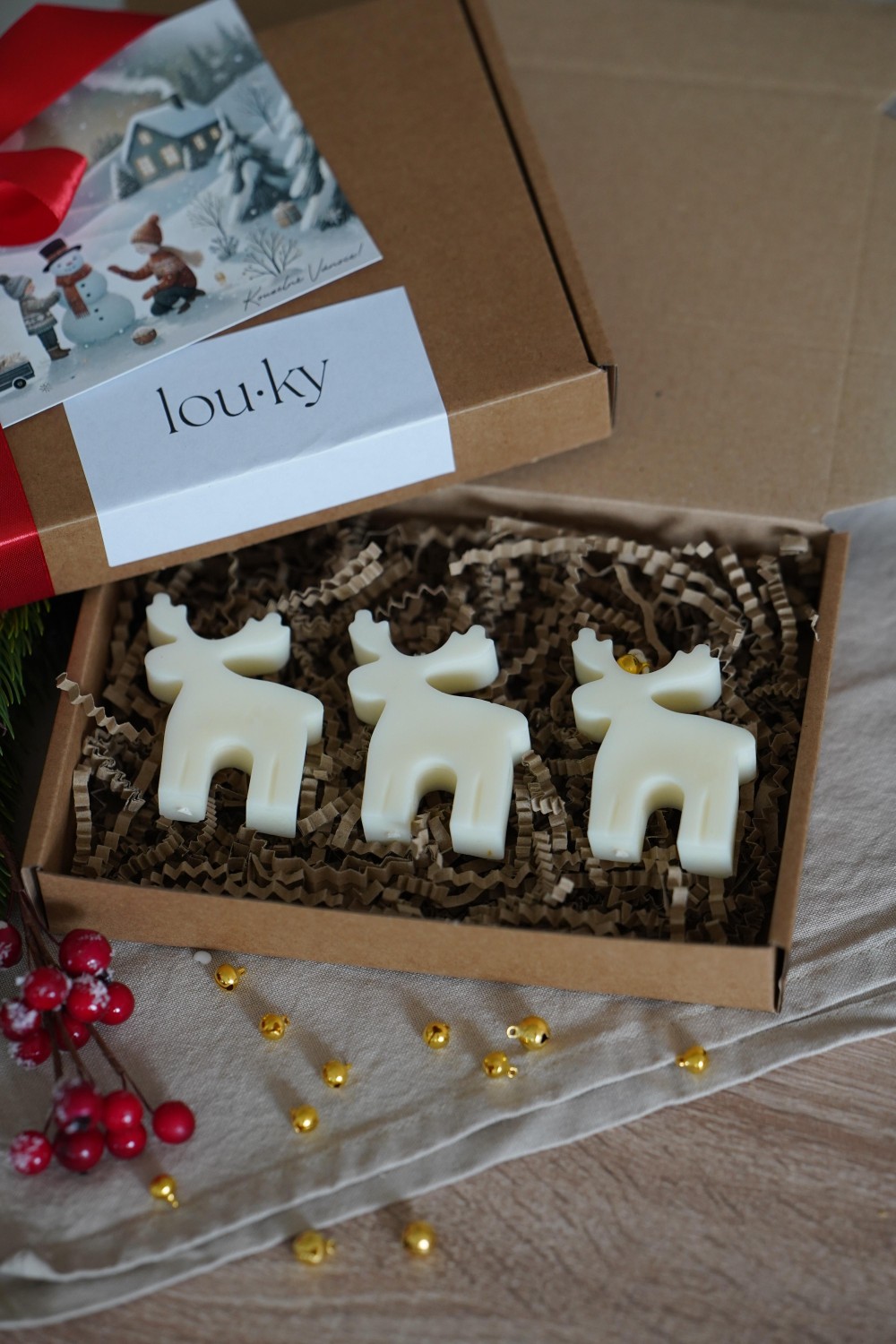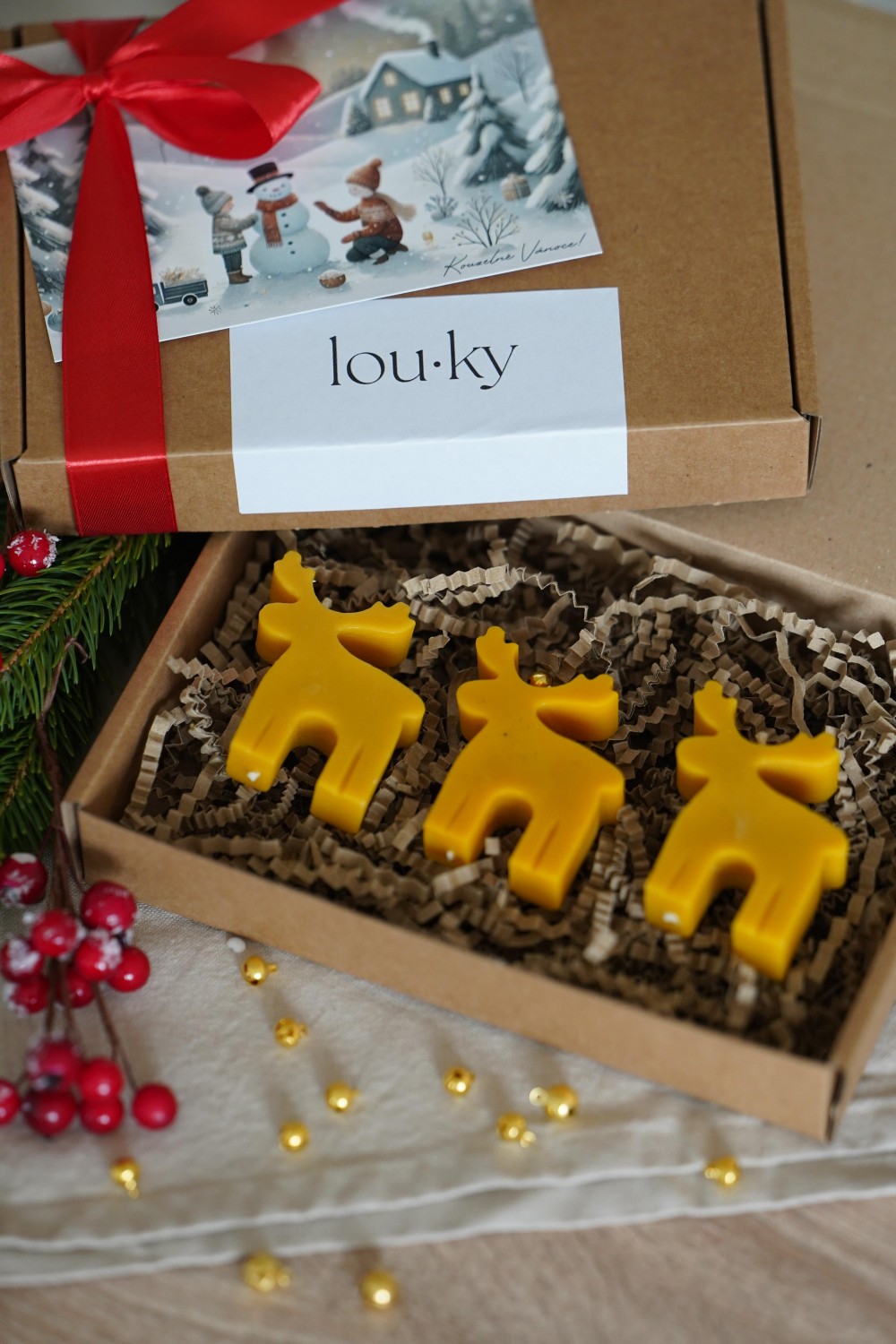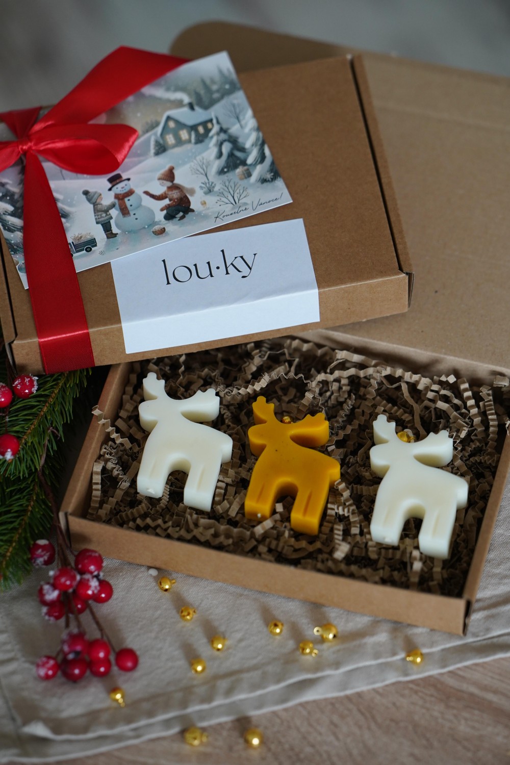 Sada tří sobů je ideální způsob jak do svého domova přinést vánoční atmosféru. Sada svíček je elegantní doplněk pro Vaše vánoční stolování nebo jako dárek pro Vaše blízké. Svíčky jsou zabalené v papírové krabici se stuhou viz. fotky. Svíčky sobů si můžete vybrat ze směsi sójového a bílého včelího vosku nebo žlutého včelího vosku.