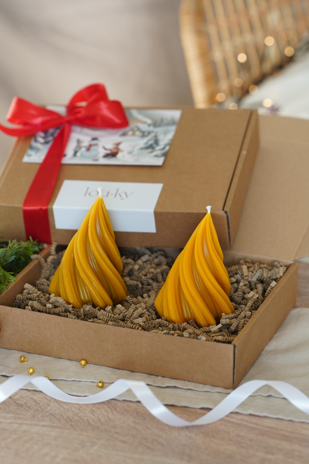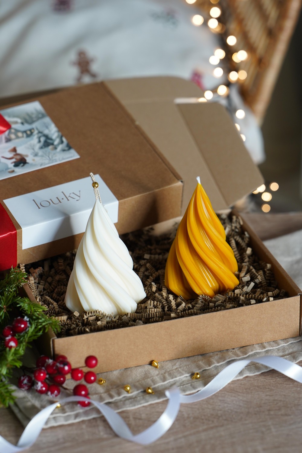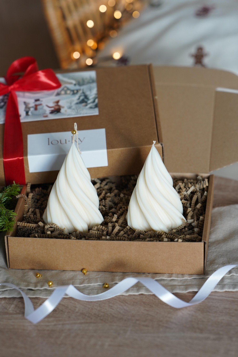 Sada svíček se skládá ze dvou velkých točených stromečků. Svíčky jsou ideální způsob jak do svého domova přinést vánoční atmosféru. Sada stromečků je elegantní doplněk pro Vaše vánoční stolování nebo jako dárek pro Vaše blízké. Svíčky jsou zabalené v papírové dárkové krabici se stuhou viz. fotky. Stromečky si můžete vybrat z čistého sójového nebo včelího vosku.