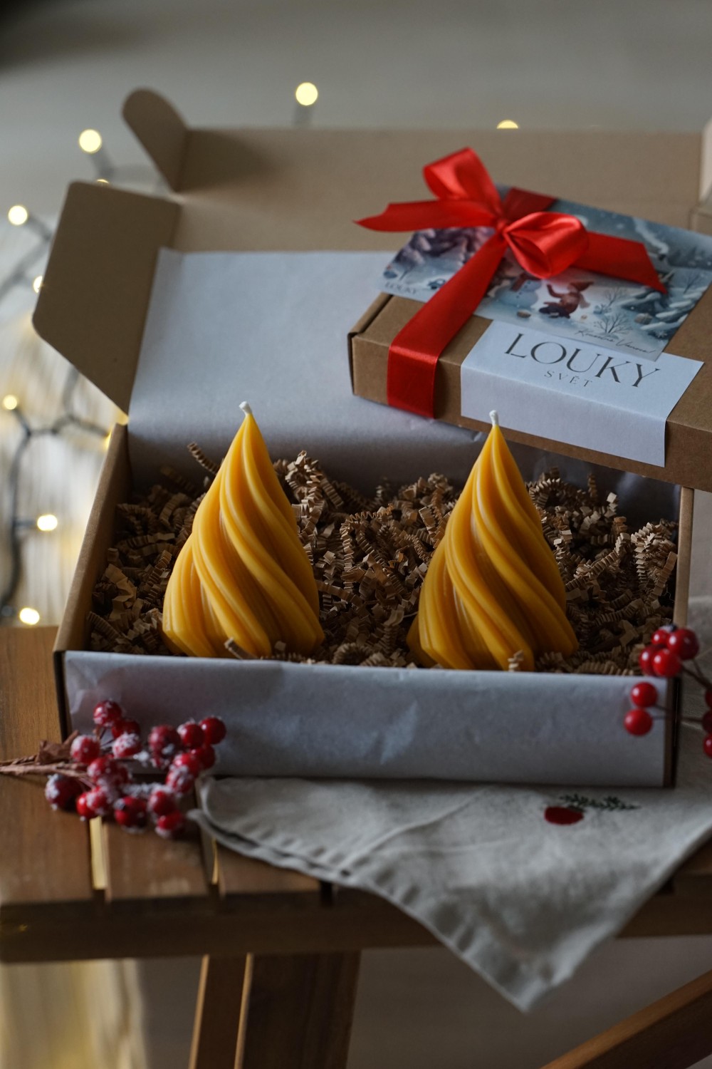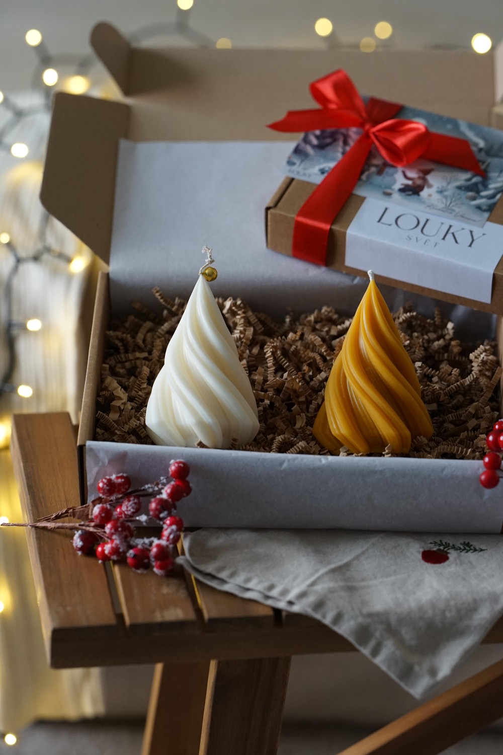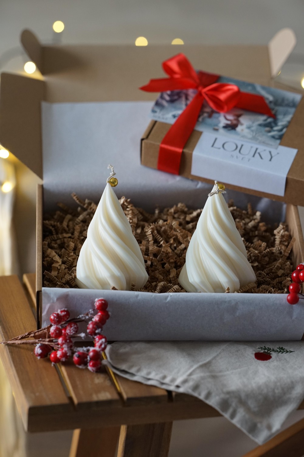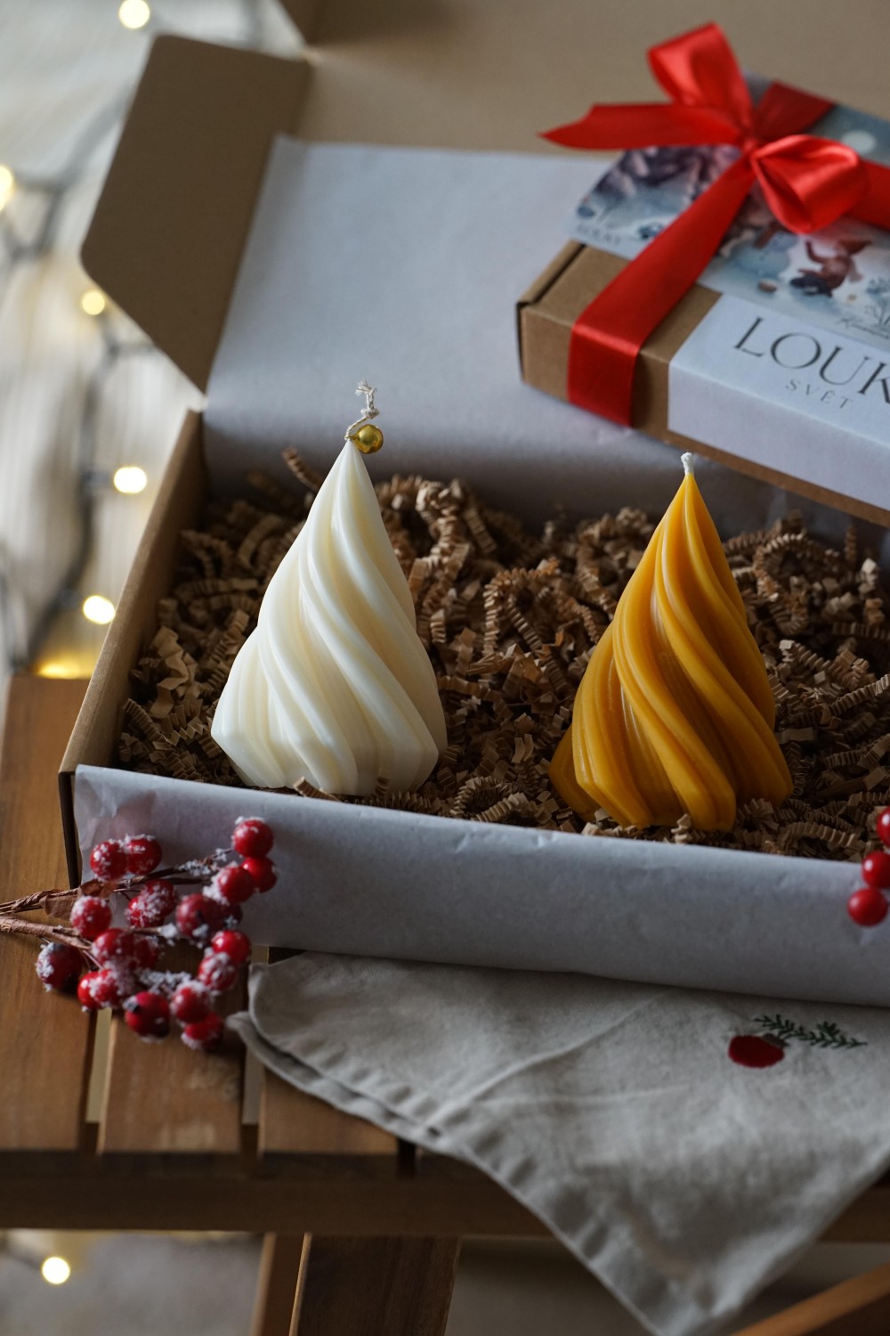 Sada svíček se skládá ze dvou velkých točených stromečků. Svíčky jsou ideální způsob jak do svého domova přinést vánoční atmosféru. Sada stromečků je elegantní doplněk pro Vaše vánoční stolování nebo jako dárek pro Vaše blízké. Svíčky jsou zabalené v papírové dárkové krabici se stuhou viz. fotky. Stromečky si můžete vybrat z čistého sójového nebo včelího vosku.