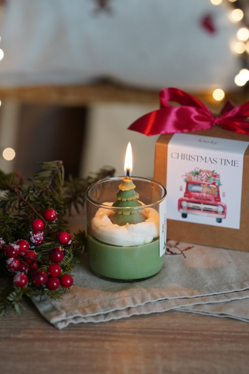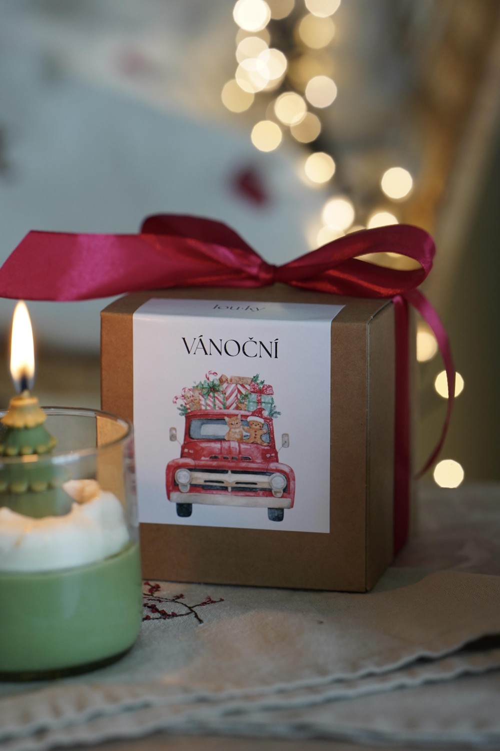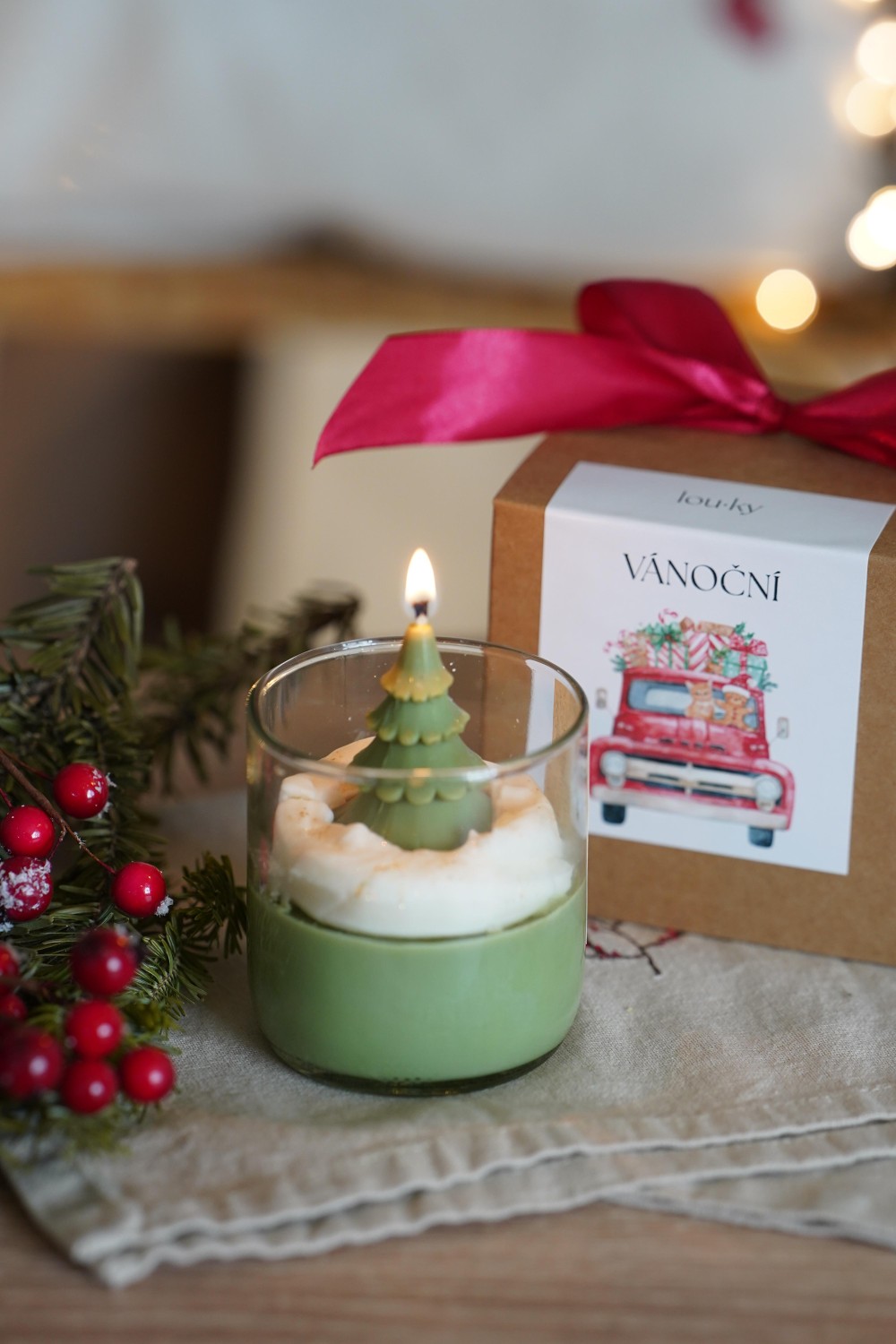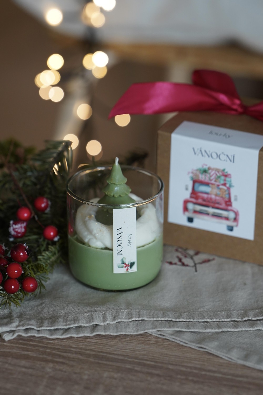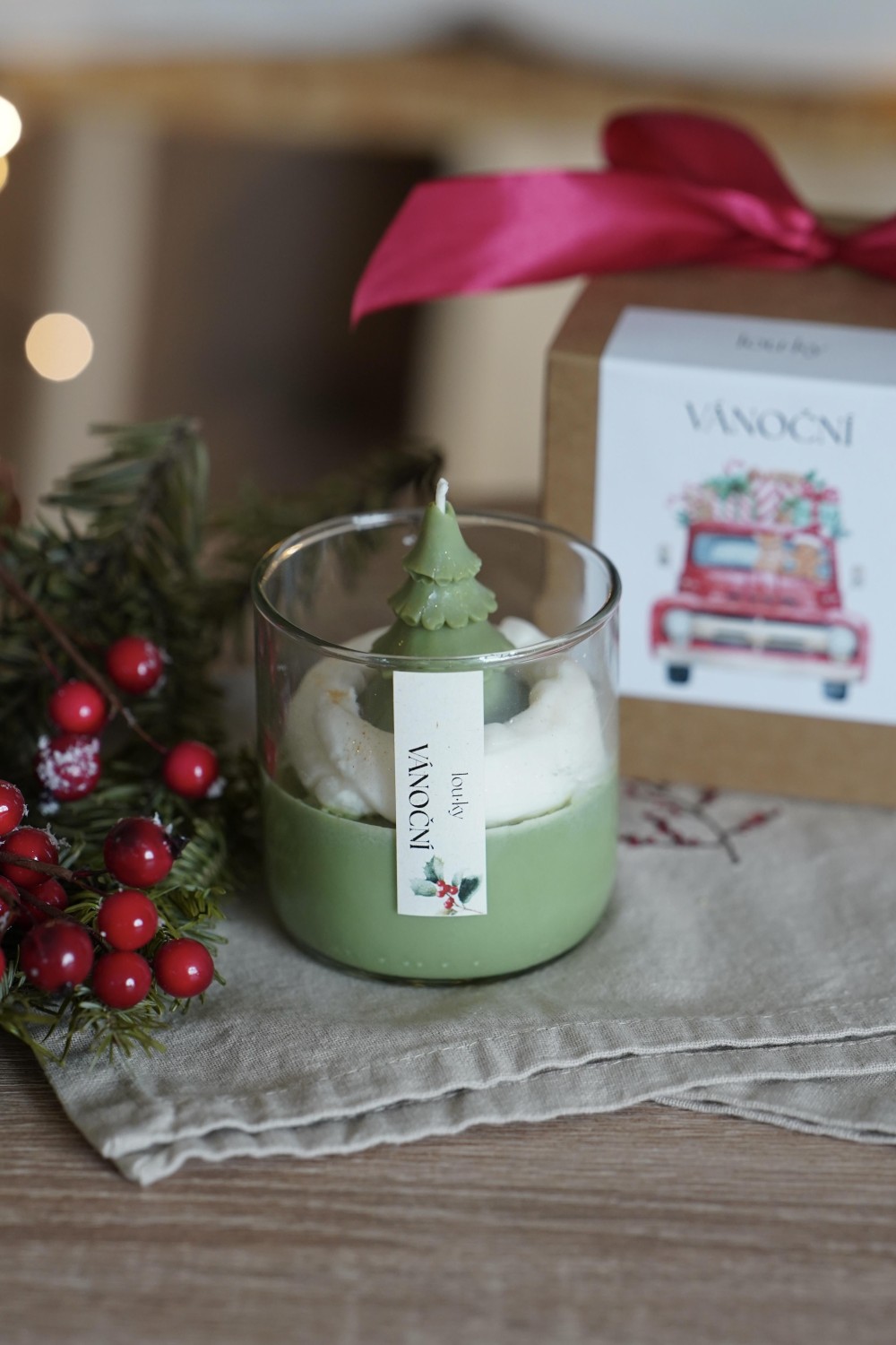 Naše Vánoční svíčka je ručně odlévaná ze sójového vosku a okouzlí vás svou sladce vanilkovou vůní s nádechem teplého koření. Horní vrstvu svíčky zdobí zelený stromeček, detail, který dodá vašemu domovu pravé vánoční kouzlo. Svíčka je posypaná jemným zlatým práškem. Při zapálení můžete vidět jak se postupně ve vosku objevují jemné zlaté třpytky. Každá svíčka je odlita do skleněné nádoby z recyklované vinné láhve a zabalená v dárkové krabičce se stuhou. Připravená potěšit jako krásný dárek i výjimečná ozdoba vašeho svátečního domova.