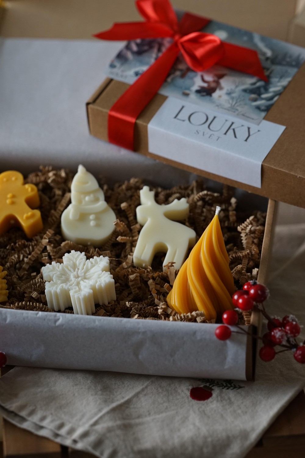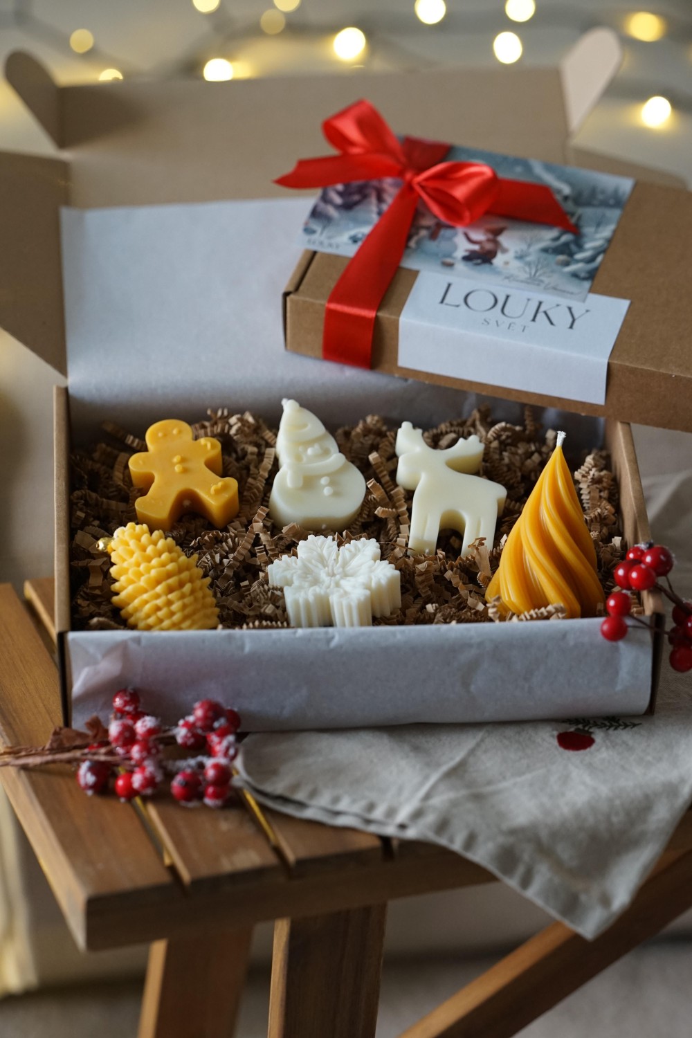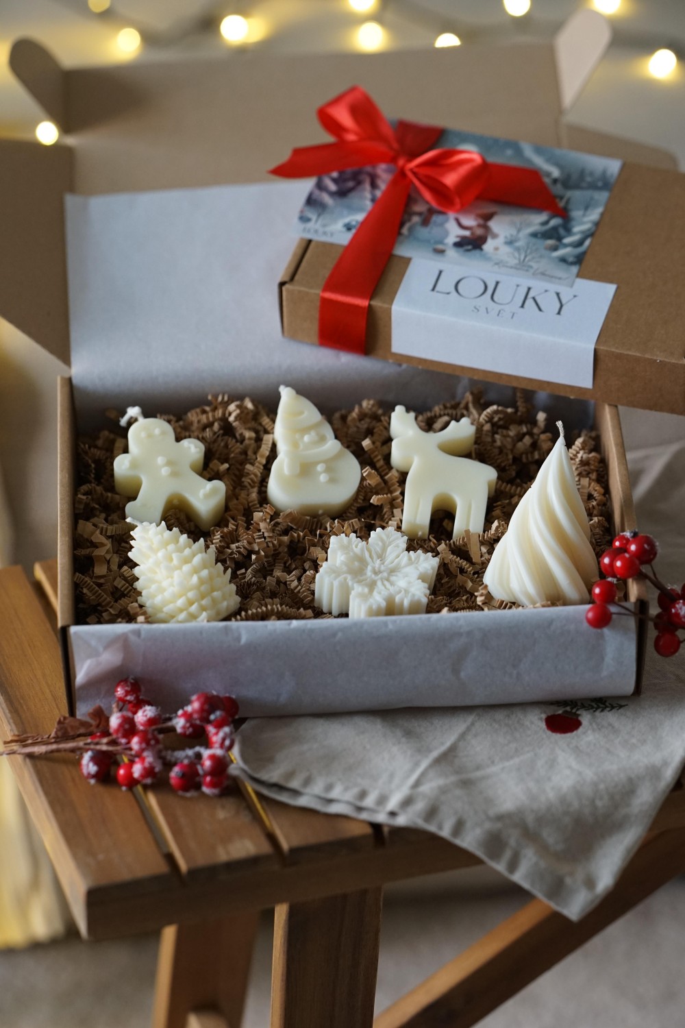 Velká vánoční sada se skládá ze šesti svíček: šišky, točeného malého stromečku, vločky, sněhuláka, soba a perníčku. Krásný doplněk pro vánoční období, stolování nebo dárek pro Vaše blízké. Svíčky jsou ručně odlévané ze směsi sójového a bílého včelího vosku nebo včelího vosku a zabalené do papírové krabice se stuhou viz. fotky.