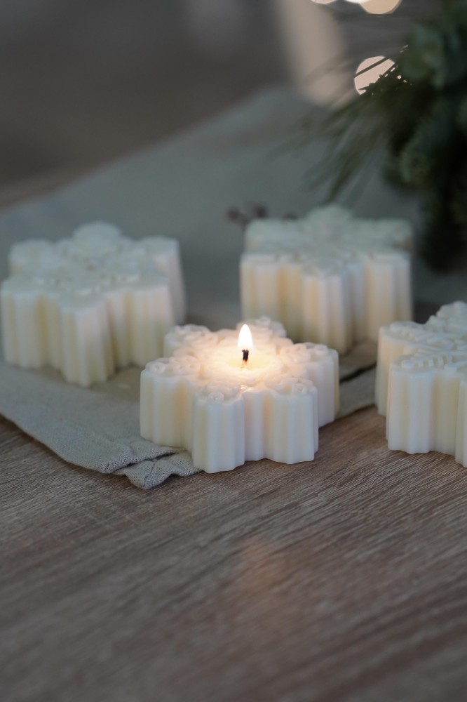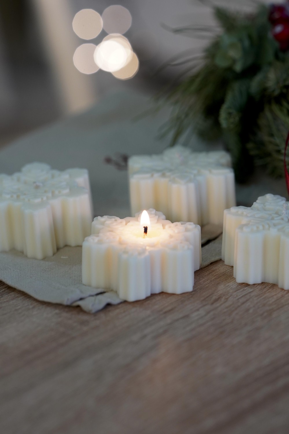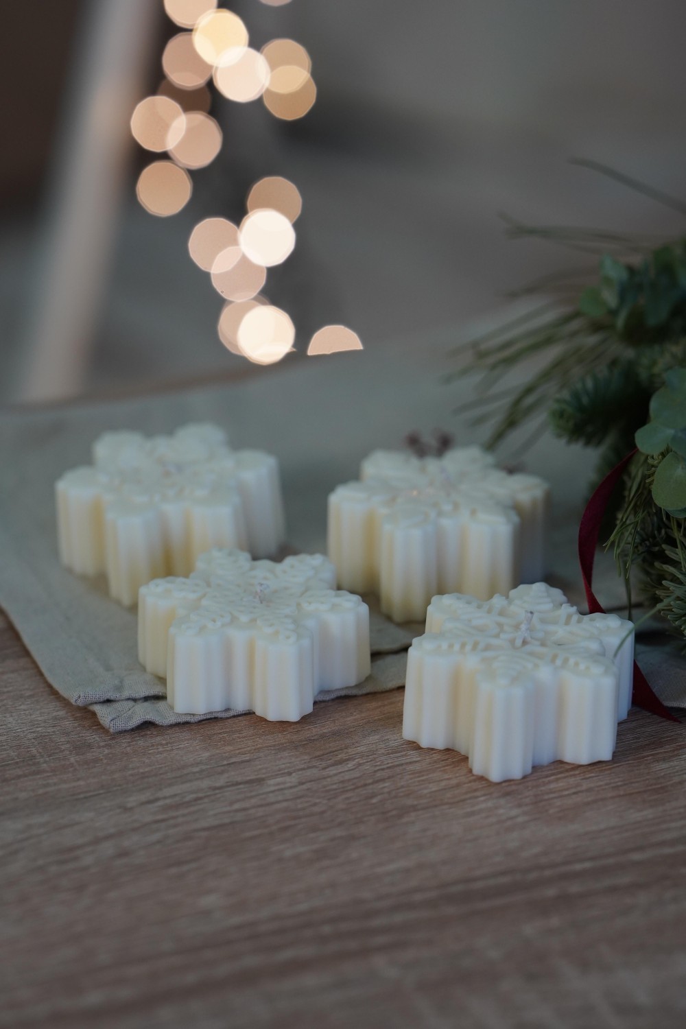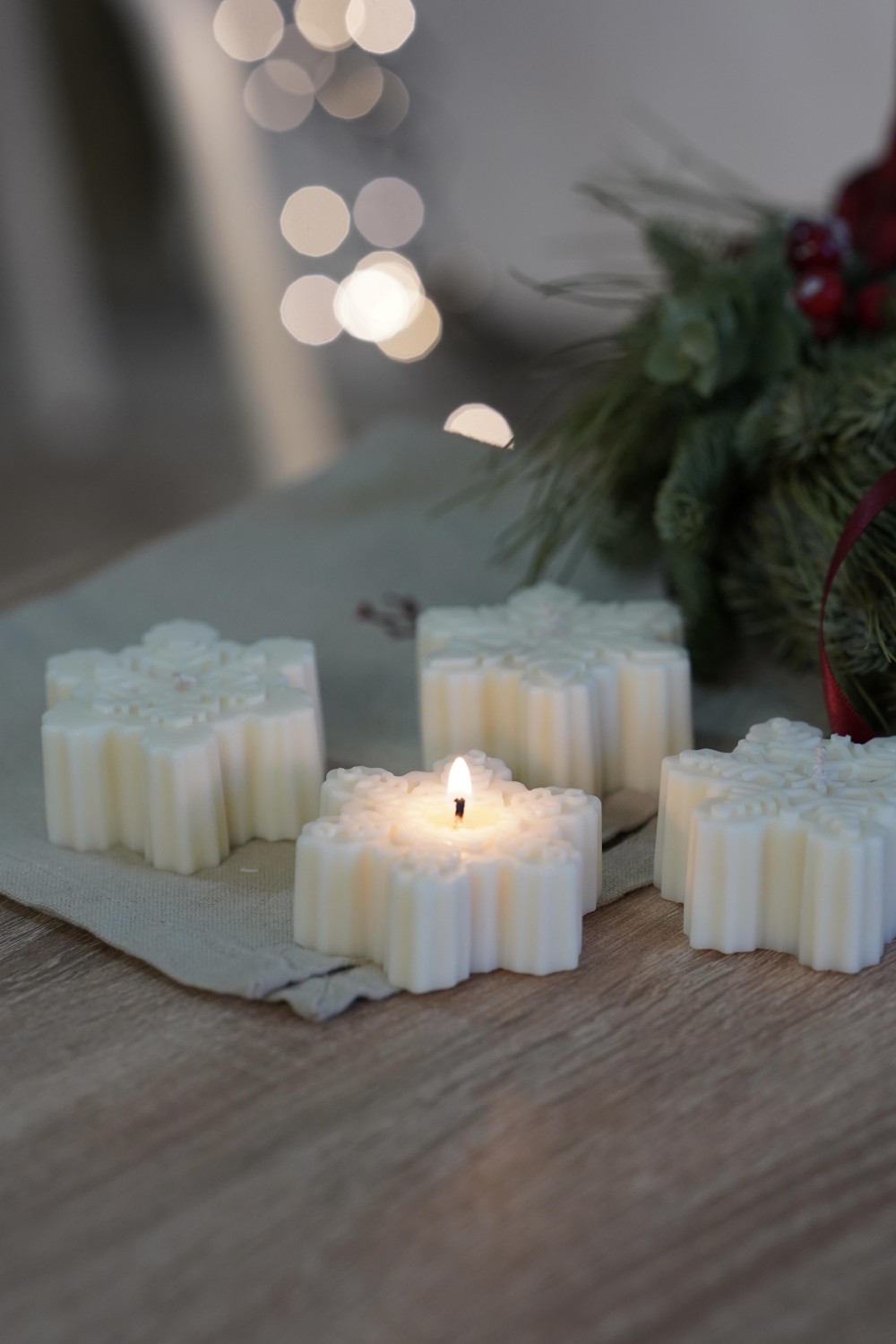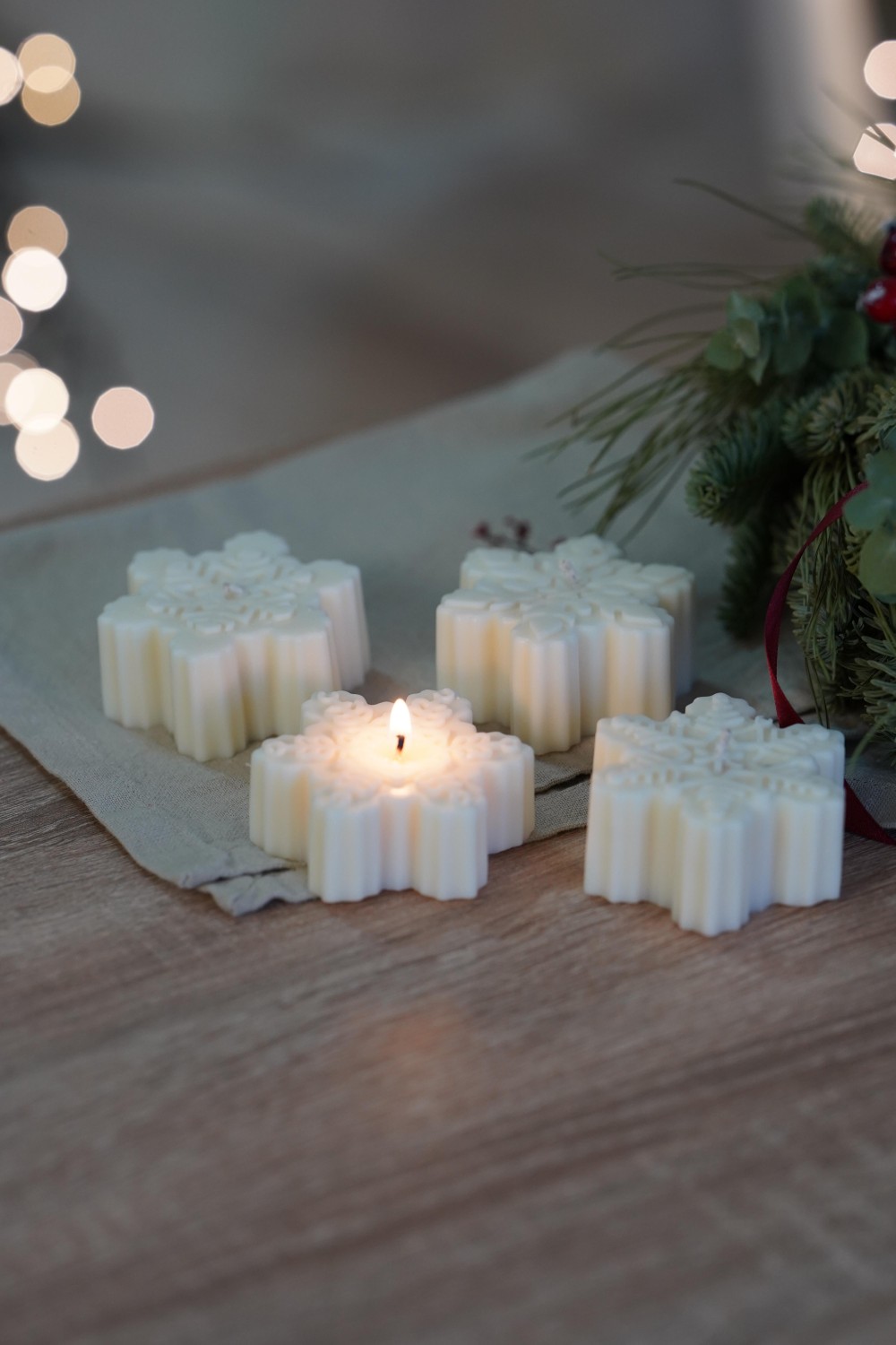 Nechte se unést kouzlem Vánoc s naší ručně vyrobenou sójovou svíčkou ve tvaru sněhové vločky. Svíčka připomíná tiché zasněžené zimní večery, světýlka na stromečku a chvíle pohody strávené s těmi nejbližšími. Tvar sněhové vločky je krásnou vánoční dekorací, která vynikne na svátečním stole, parapetu i jako součást adventní výzdoby.