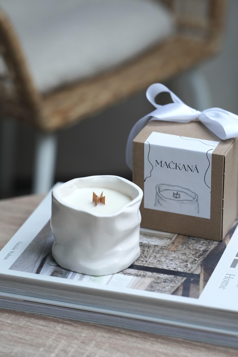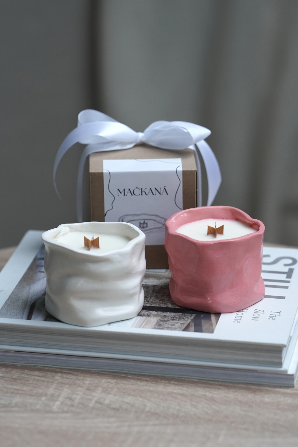 Objevte kouzlo dokonalé nedokonalosti s naší svíčkou Mačkaná, kterou jsme celou navrhli, vymodelovali a vytvořili. Svíčka je na výběr ze dvou barev a dvou jemných vůní. Bílá svíčka spojuje nádhernou vůni mandlí a kdoulí. Světle růžová svíčka snoubí vůní kořeněné vanilky. Nádoba na svíčku je vyrobená z ekologické hmoty Jesmonite v přírodním bílém a světle růžovém odstínu. Tvar připomíná nepravidelnou a mačkanou nádobu. Uvnitř se nachází sójový a kokosový vosk s křížovým dřevěným knotem. Svíčka je zabalená v krabičce se stuhou viz. fotky.