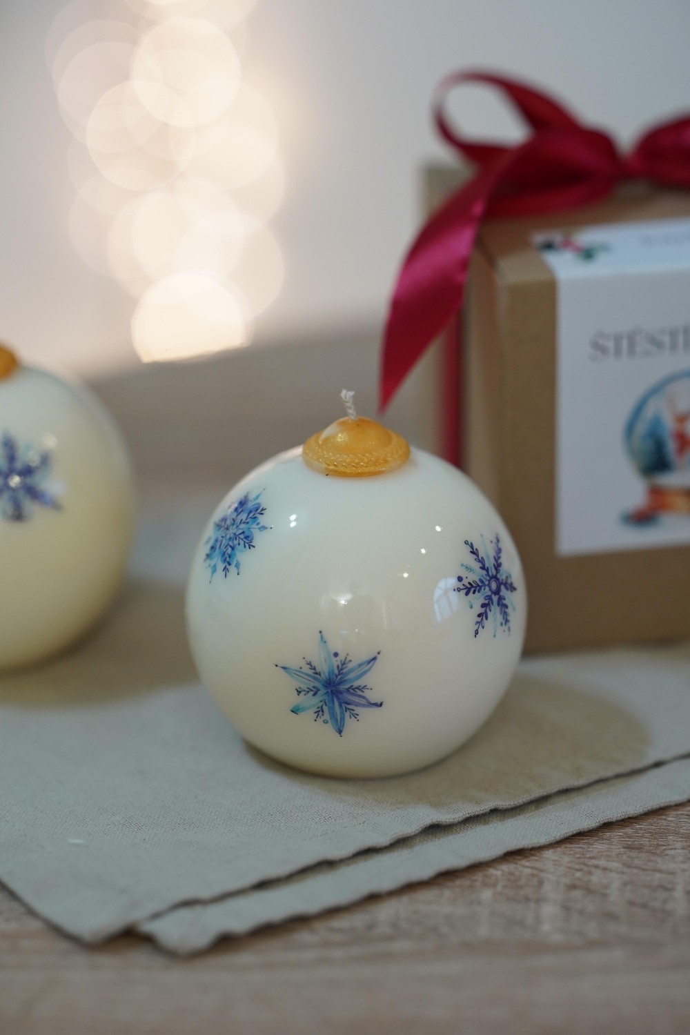 Druhou ozdobou na výběr je zdobená modrými sněhovými vločkami, která evokuje tiché zimní dny, padající sníh a čistou, klidnou atmosféru vánočního času. Obě svíčky spolu krásně ladí a doplňují se. Jedna svíčka je hřejivá a hravá, druhá jemná a snová. Je jen na vás kterou si vyberete.