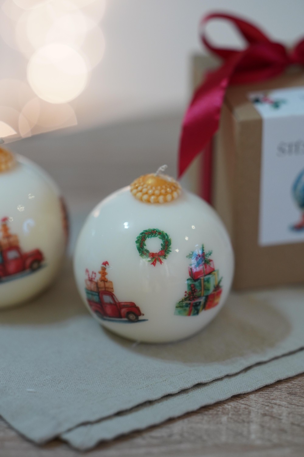 Svíčka je ručně odlitá ze sójového vosku a zdobená jemnými vánočními motivy ( perníčky, stromečky, autíčky se zvířátky a dárky,...). Obrázky vypráví příběh dětské radosti, návratů domů a klidných chvil strávených s rodinou. Každý detail připomíná kouzlo starých Vánoc, kdy stačilo málo ke štěstí.